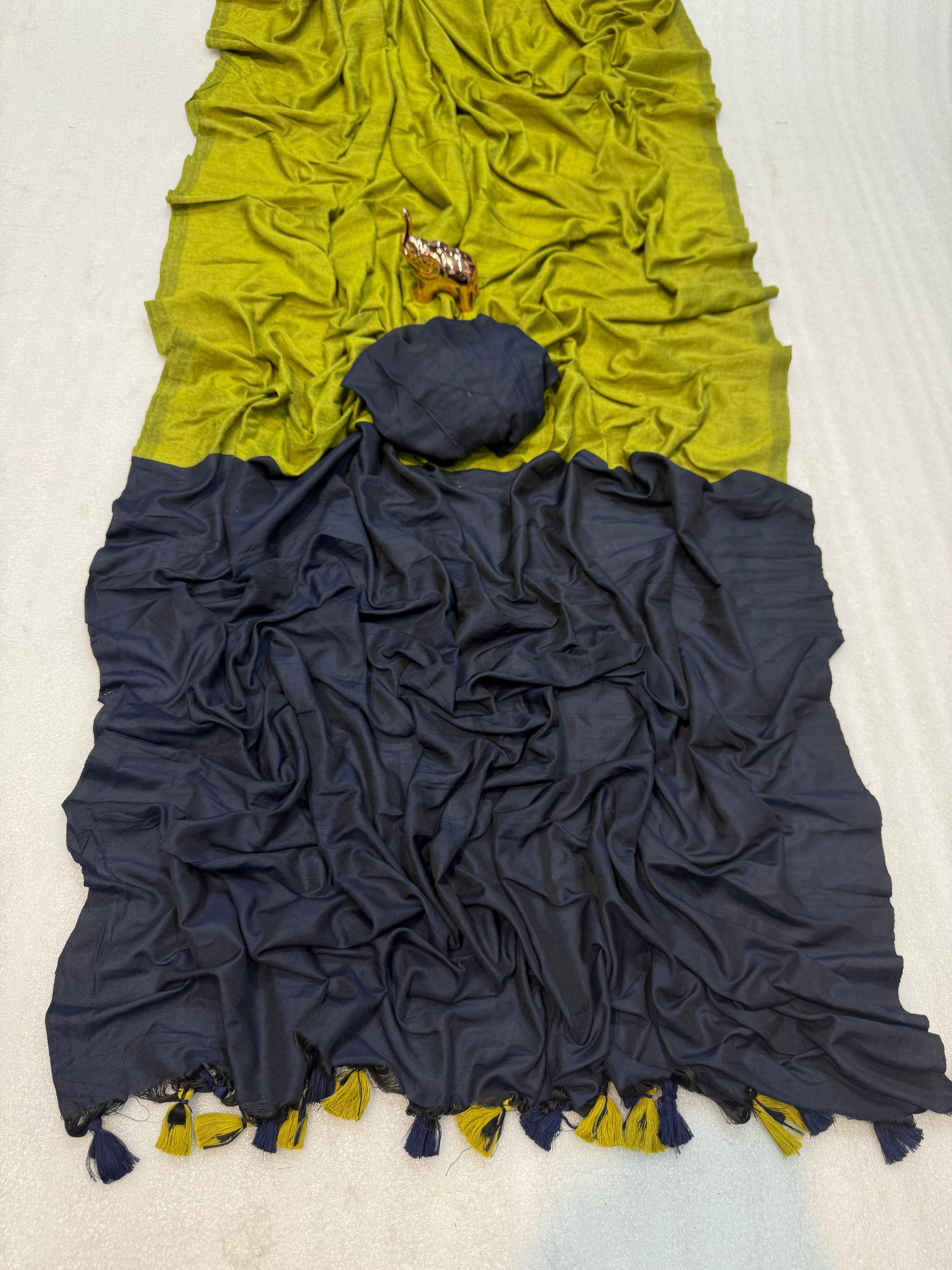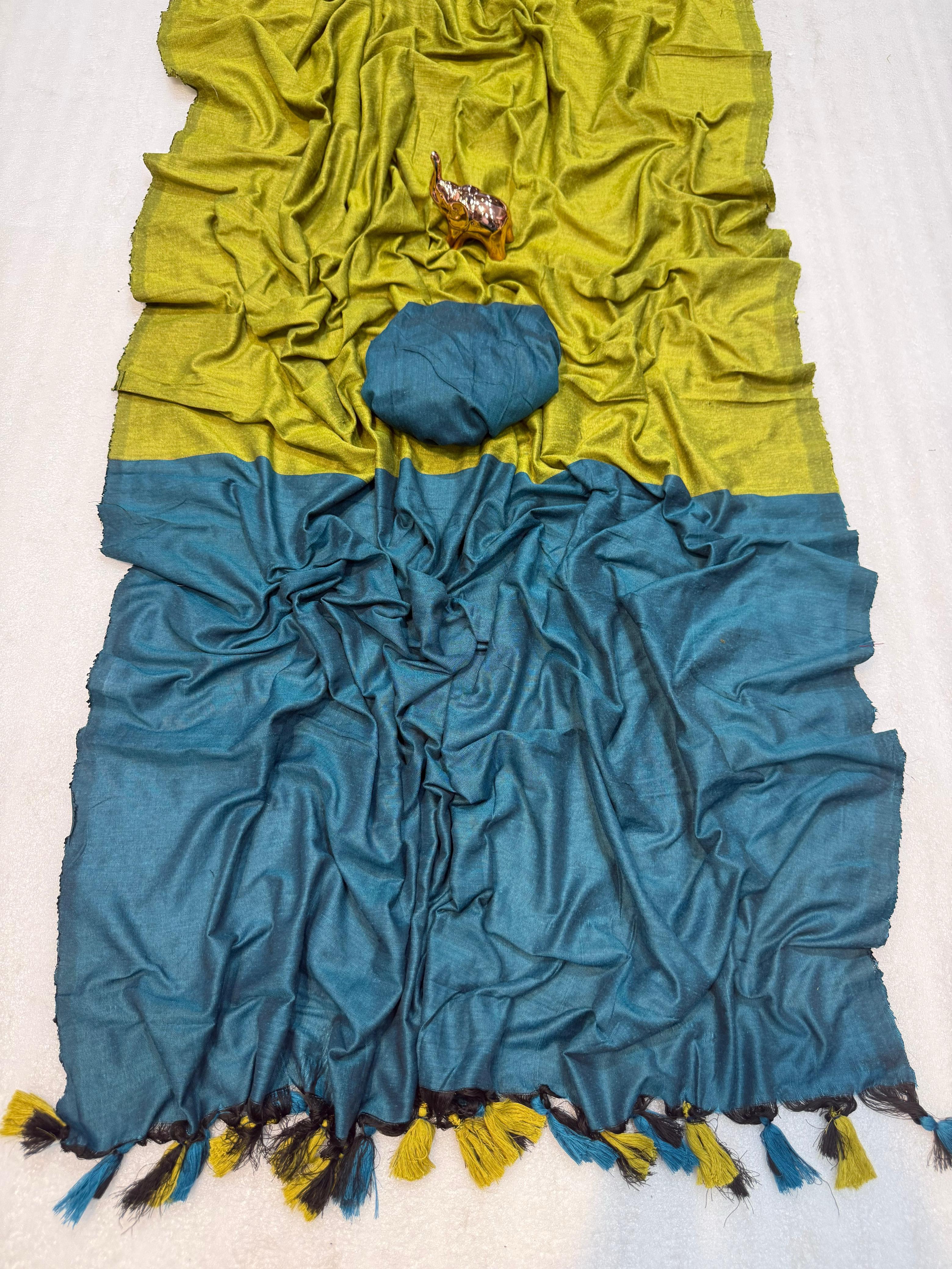 Step into elegance with this Mal Cotton Saree featuring a contrast blouse and pallu adorned with beautiful latkans. The soft fabric ensures comfort, while the stylish design makes it perfect for festive occasions, parties, and daily wear.