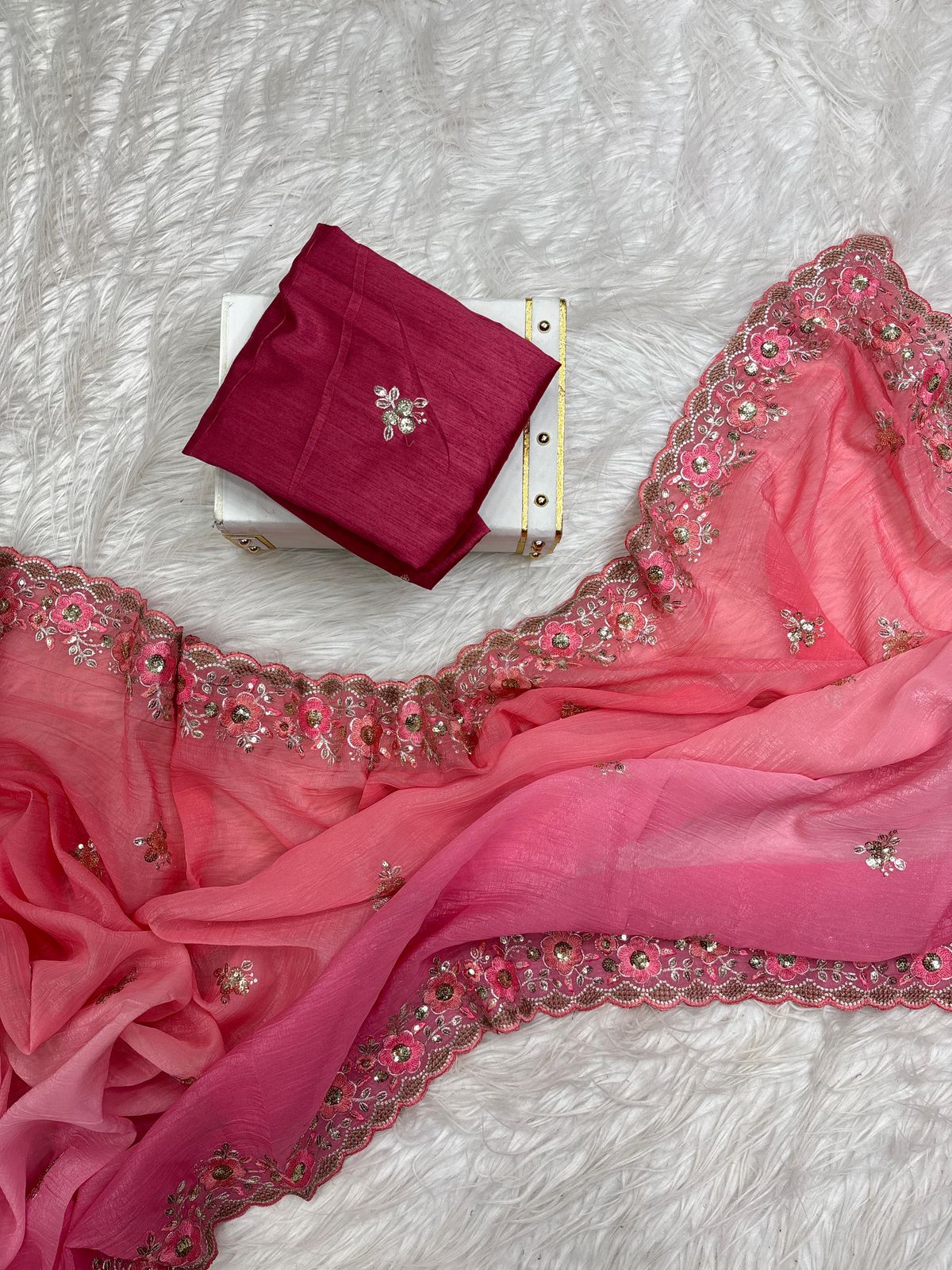 • Saree Work: 5mm sequence embroidery with multi-thread embroidery and arc cutting border