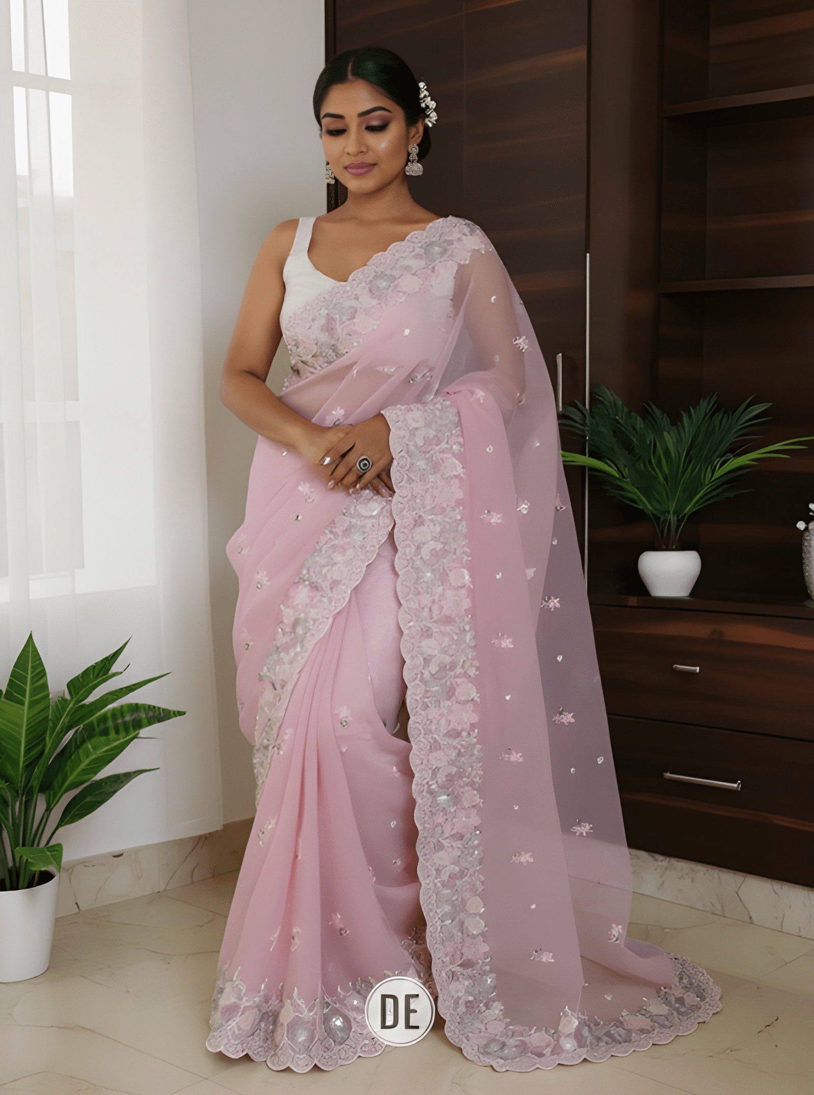 Star Sarees – Jimmy Choo Silk Saree with 3mm Sequence C Pallu & Arco Cut Work Border