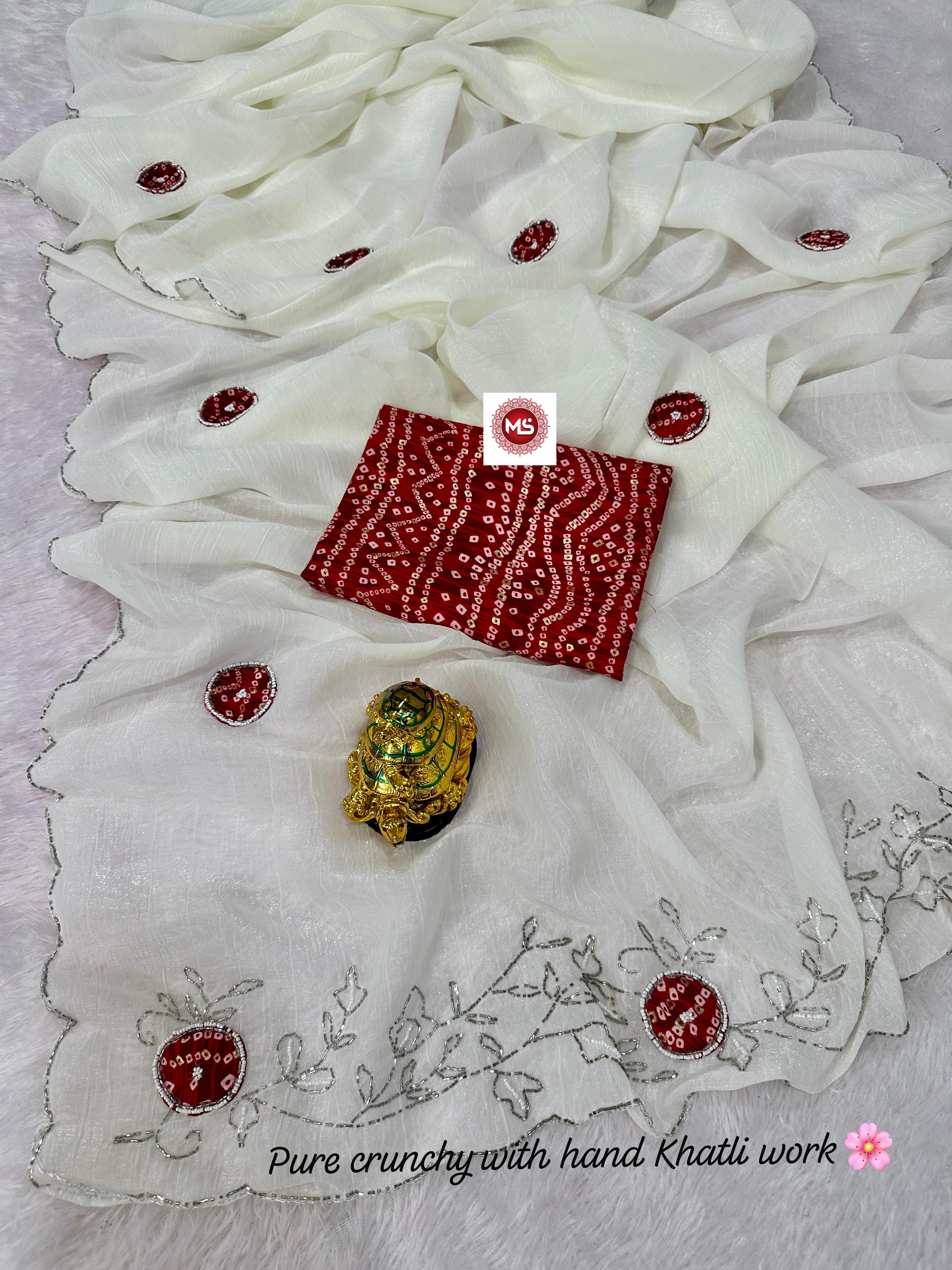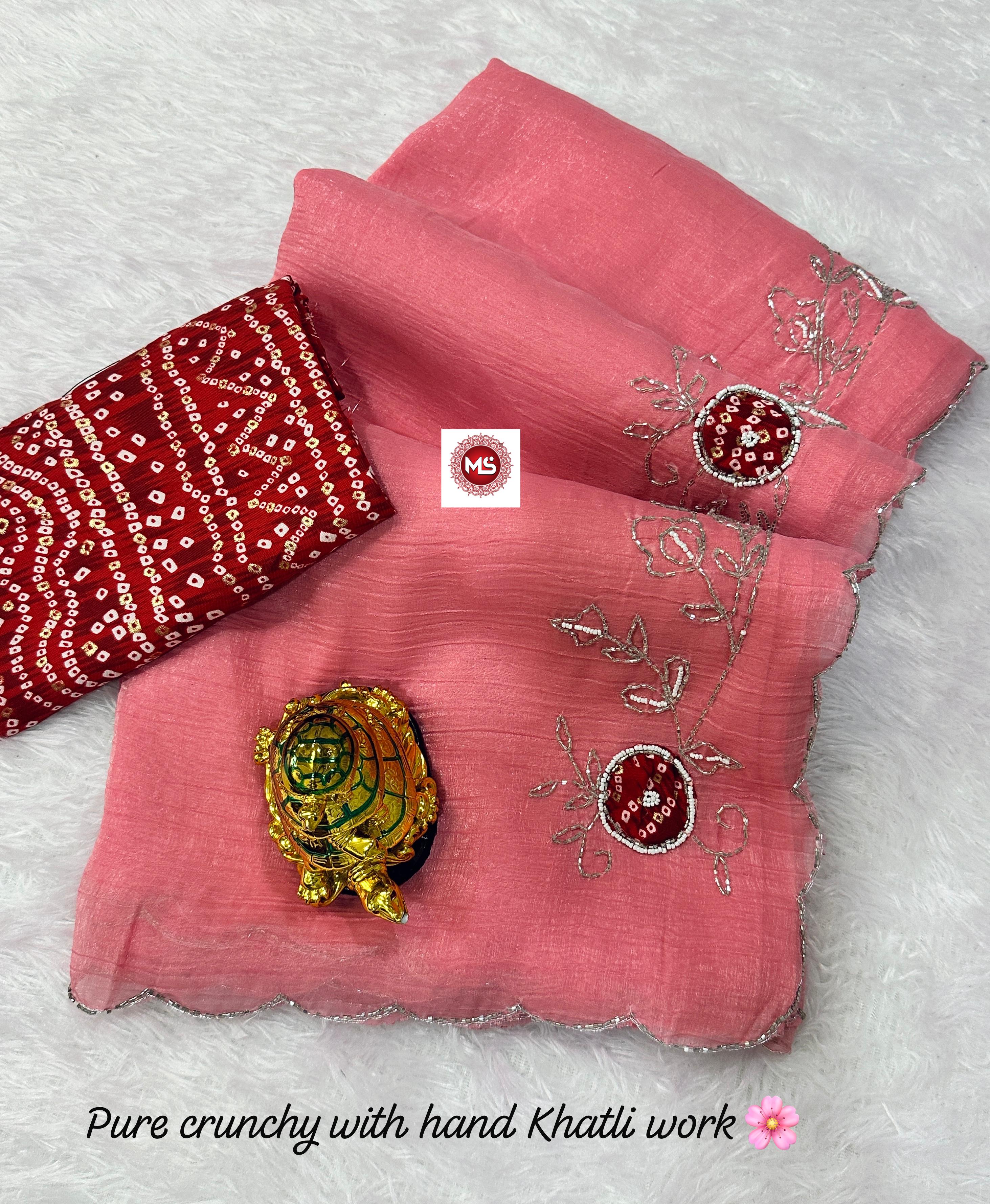 - Saree Work: Kutdana, Moti Handwork with Bandhej Patch & Hand Khatli Work on C.Pallu
