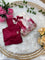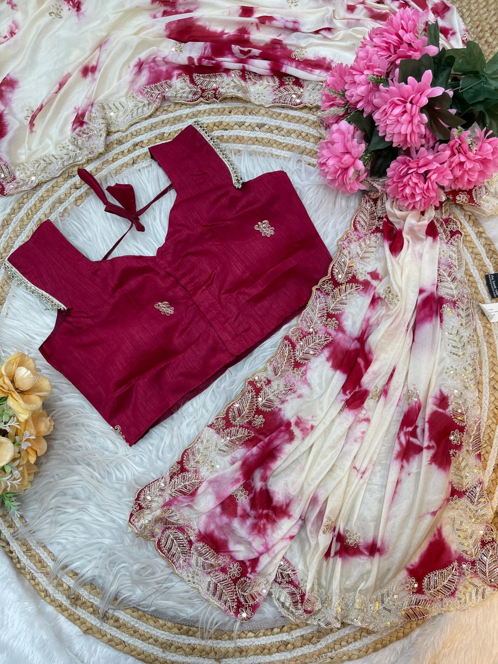 Step out in grace with this very soft and elegant pure chinon prism dyble saree, beautifully crafted with intricate embroidery and delicate 3mm sequins cording work. The saree boasts a heavy border and all-over buttis for a rich, timeless look. Complemented by a fully stitched fancy pattern blouse made from raw silk fabric, detailed with embroidery and elegant mirror lace accents. The blouse fits comfortably up to size 42". Available in 3 stunning, eye-catching colours. Perfect for weddings, parties, and festive occasions.