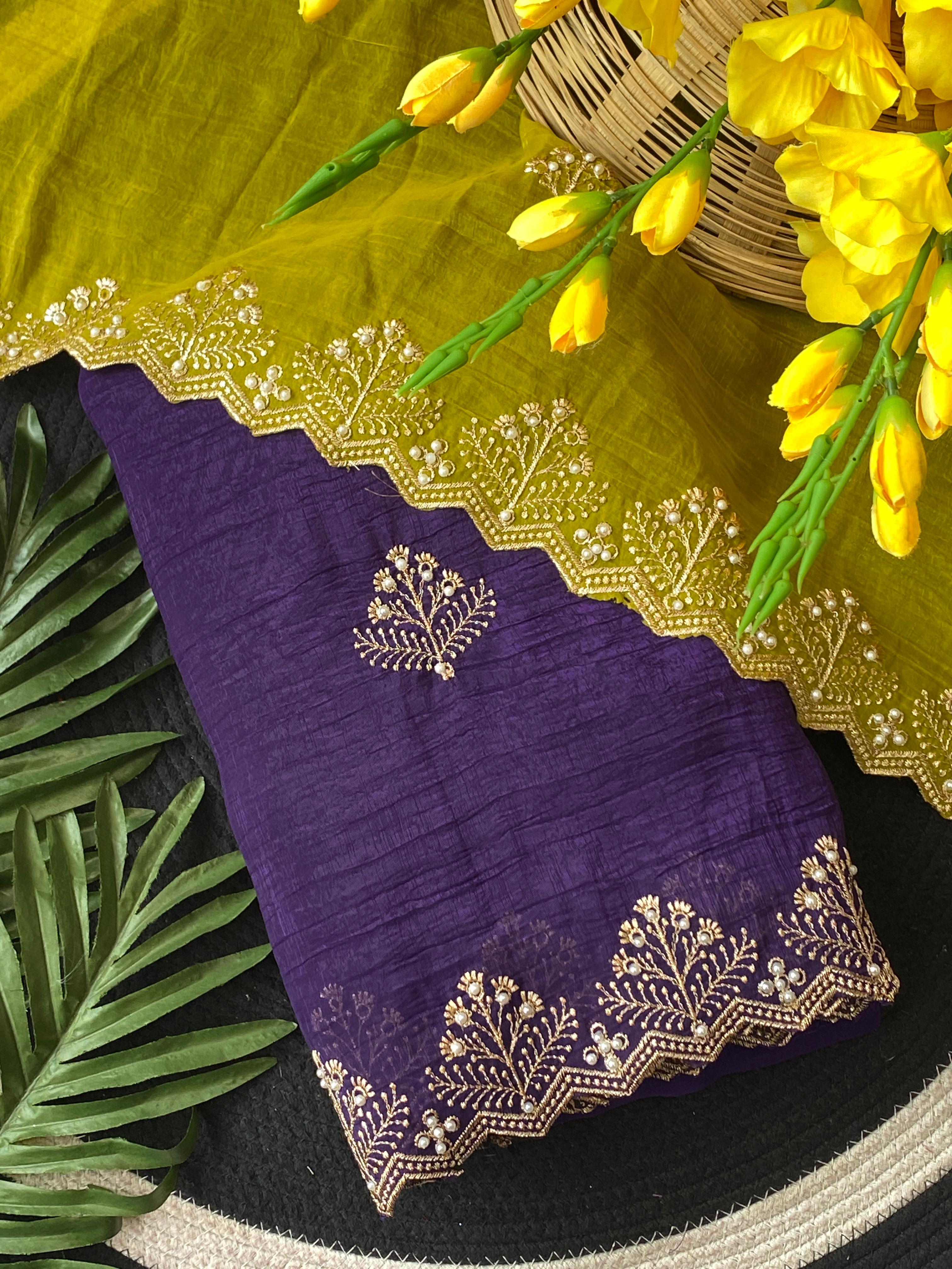 New Arrival Crunchi Soft Silk Saree with Embroidery, Moti Work & Scalloped Cutwork Border | Contrast Work Blouse | Festive & Wedding Wear