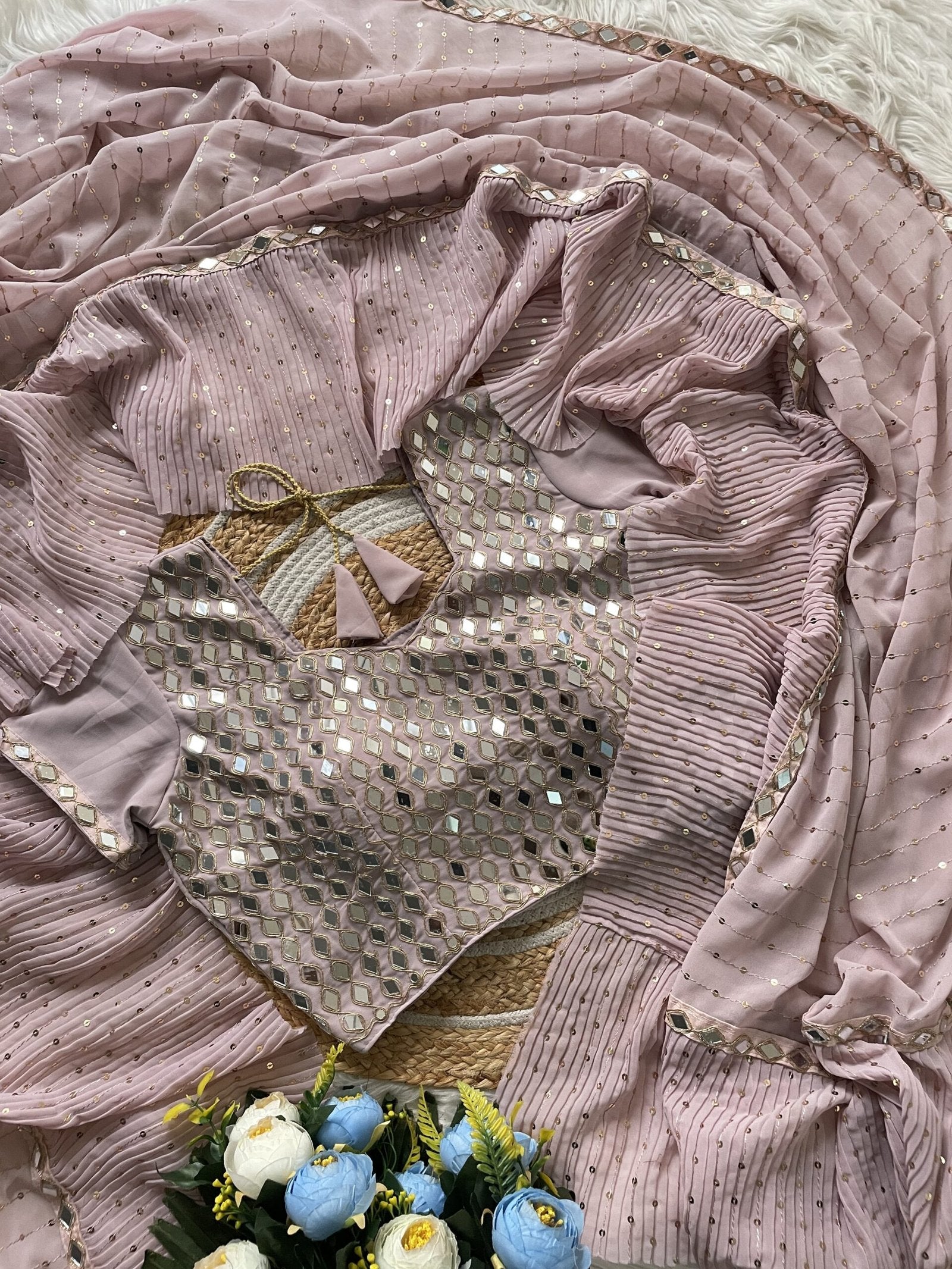 - Work: Heavy 5MM Sequin Embroidery with Crush Pleats