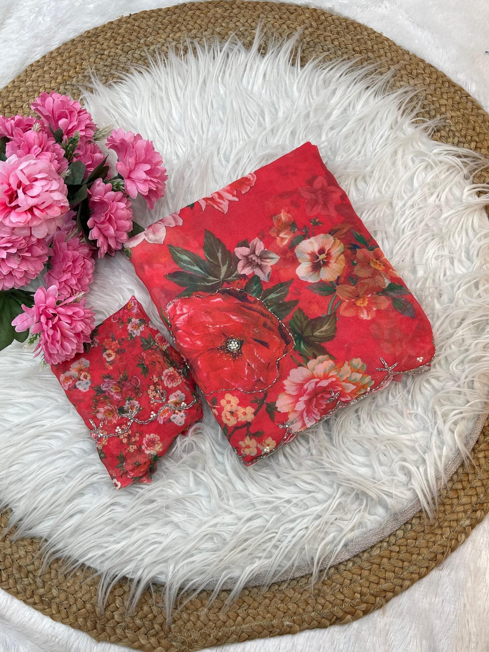 Pure Soft Georgette Saree with Floral Prints & Heavy Hand Khatli + Cutdana Work image 0