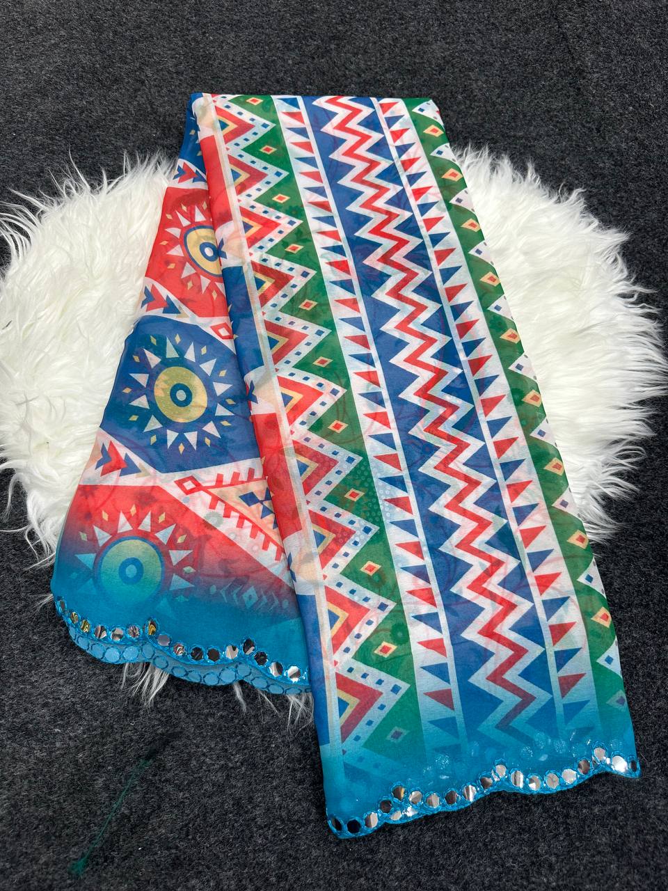 ✨ Pattern: Printed Saree with Mirror Work Border