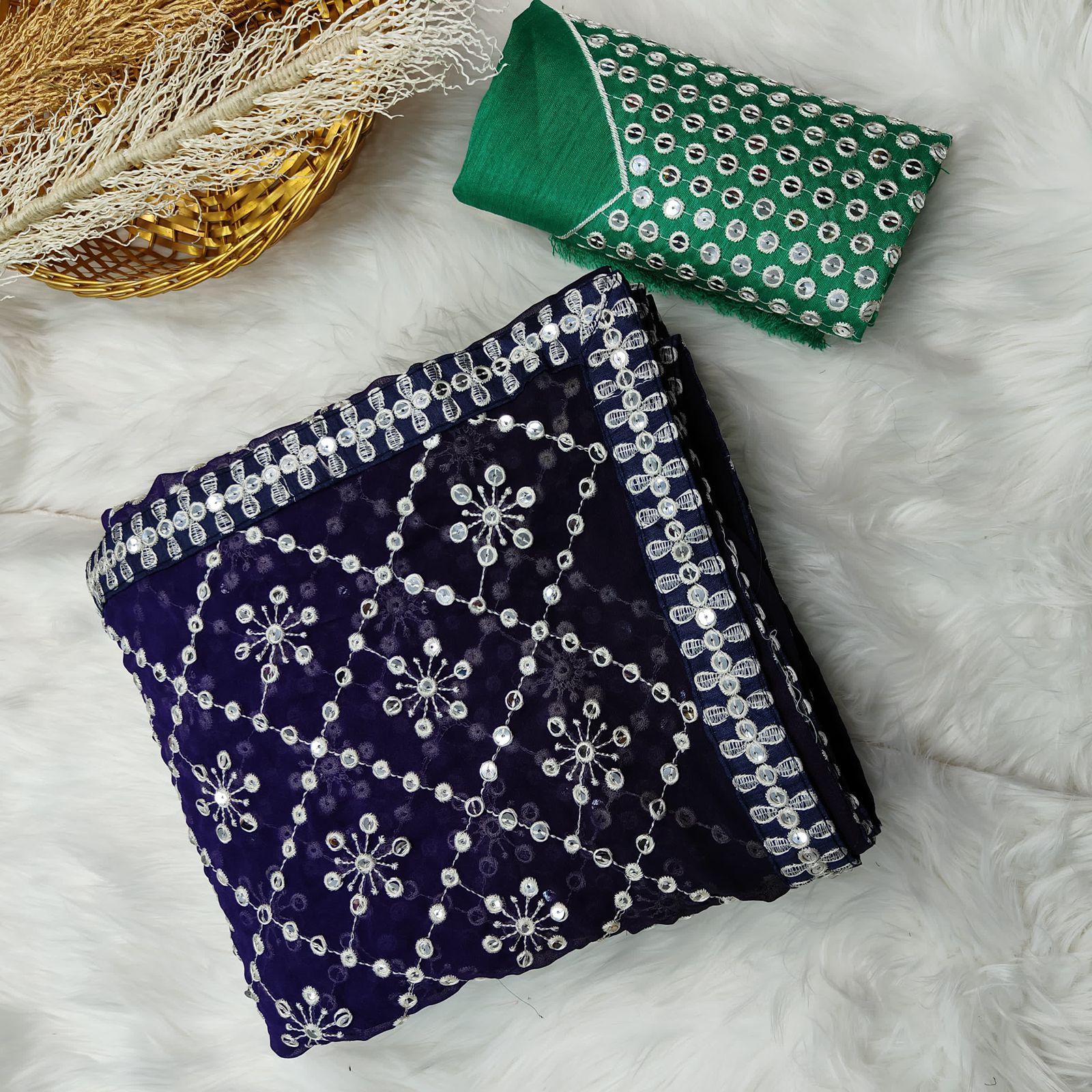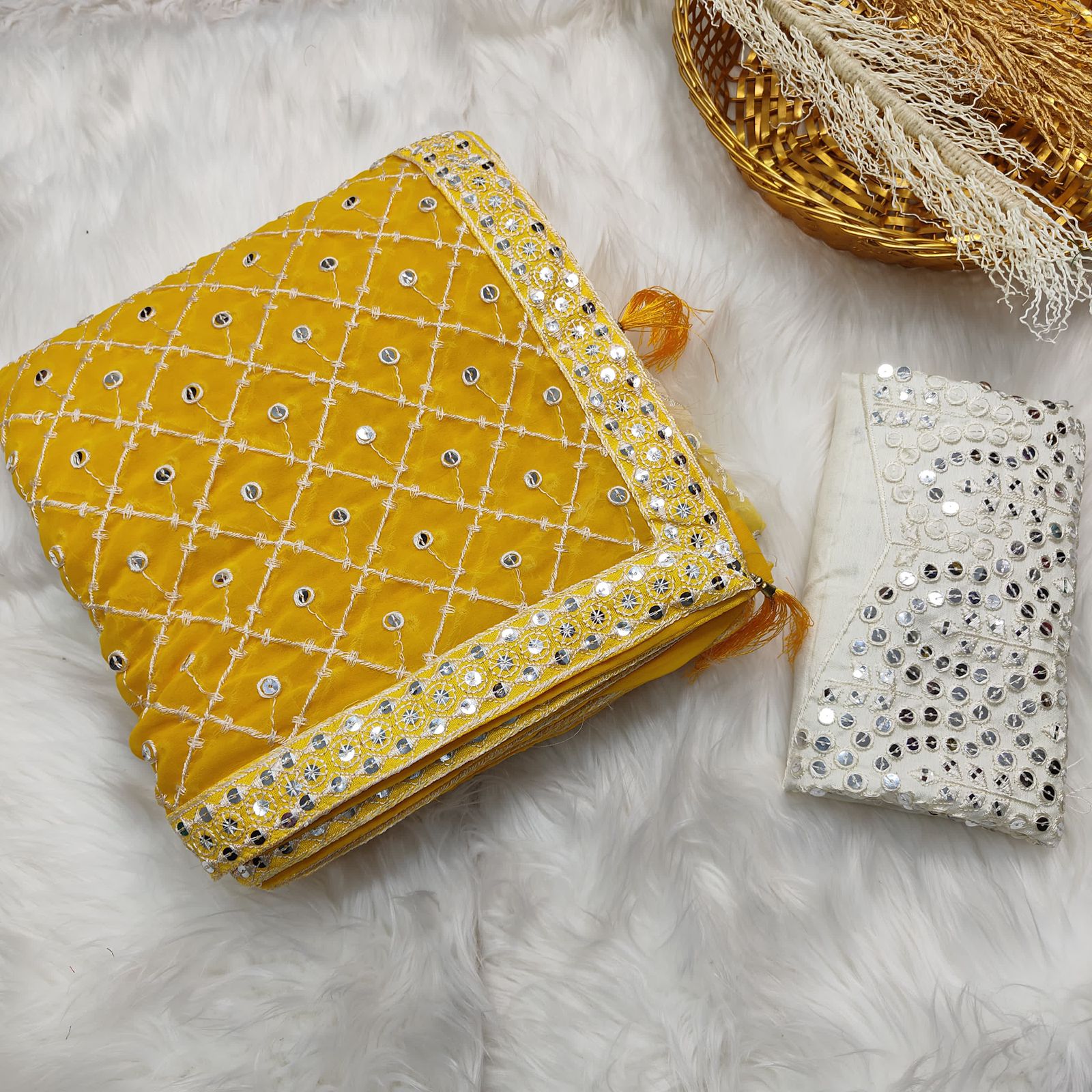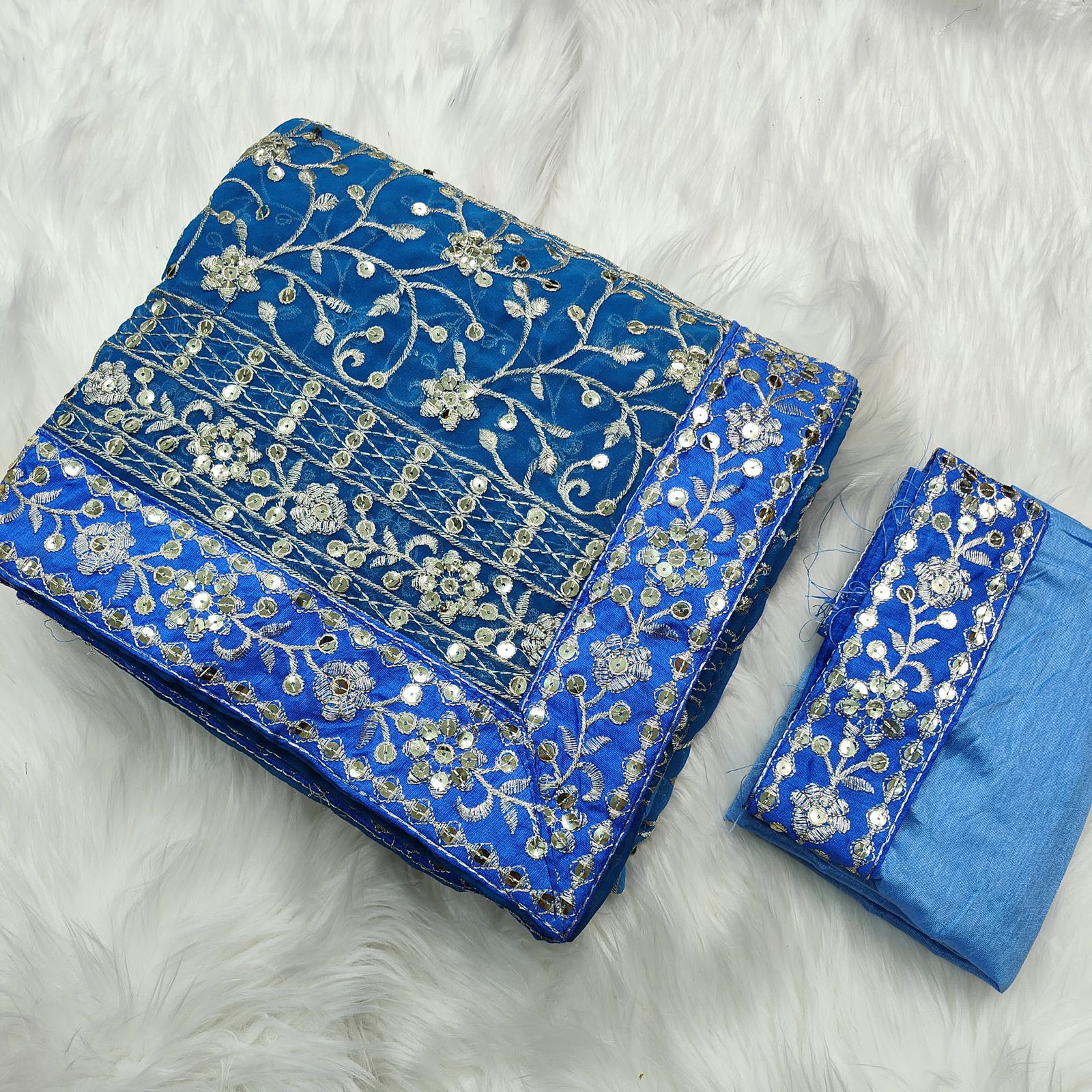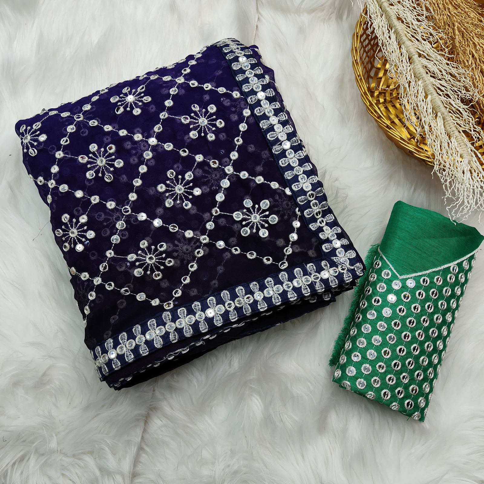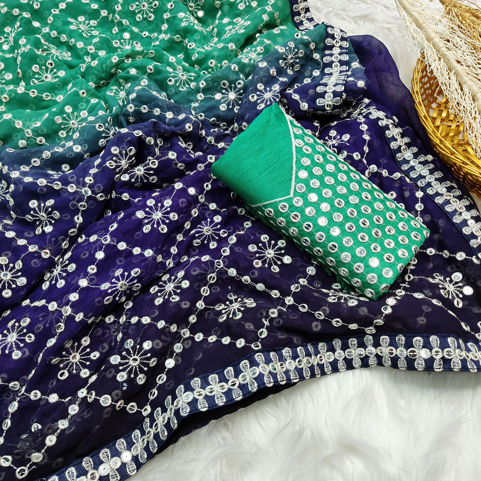 •     Blouse Work: Embroidered with 7mm Sequence & Thread Work