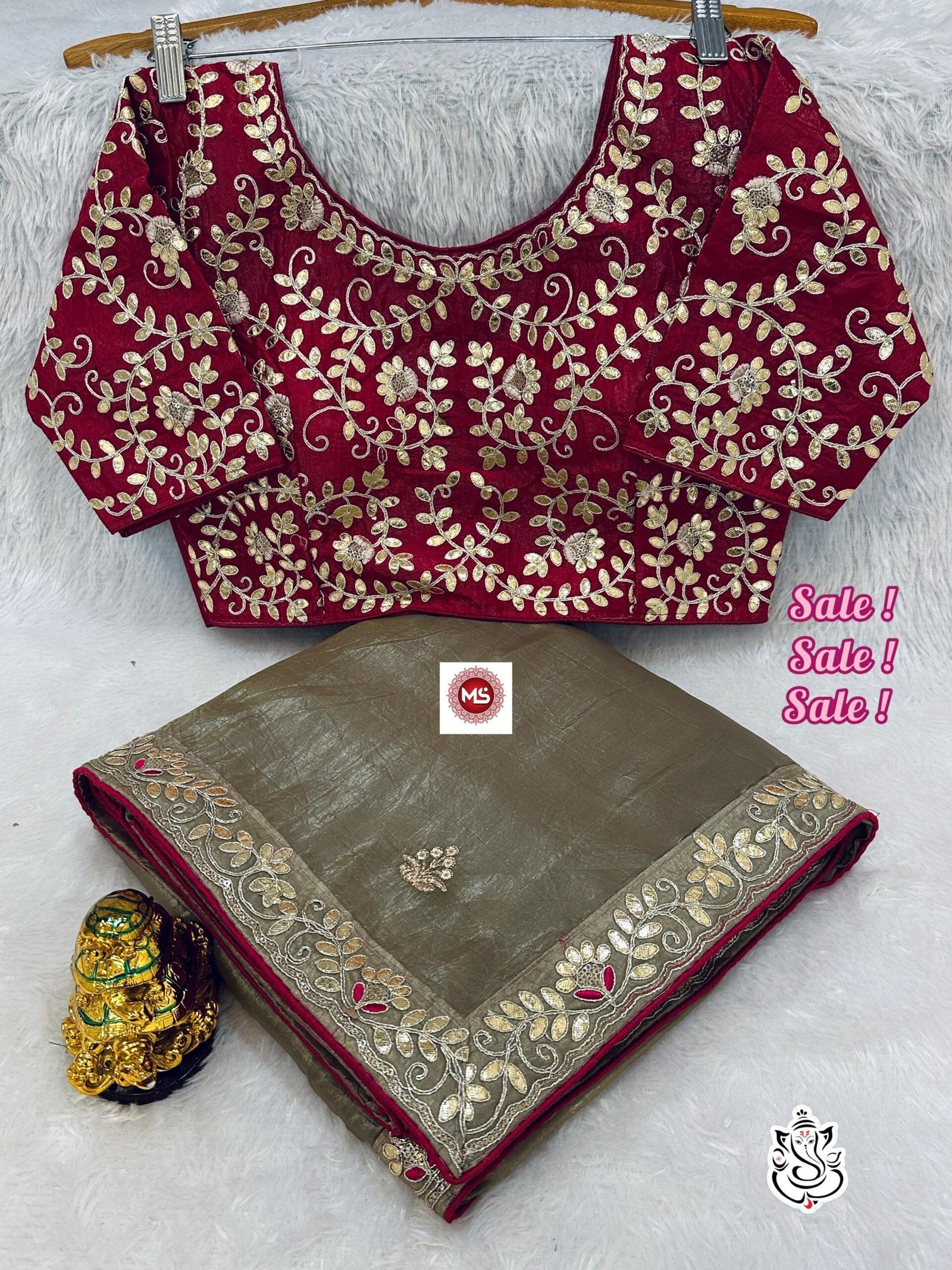 Premium Gold Crush Saree with Rich Gotapatti & Sequence Work + Stitched Blouse - Olive Grey image