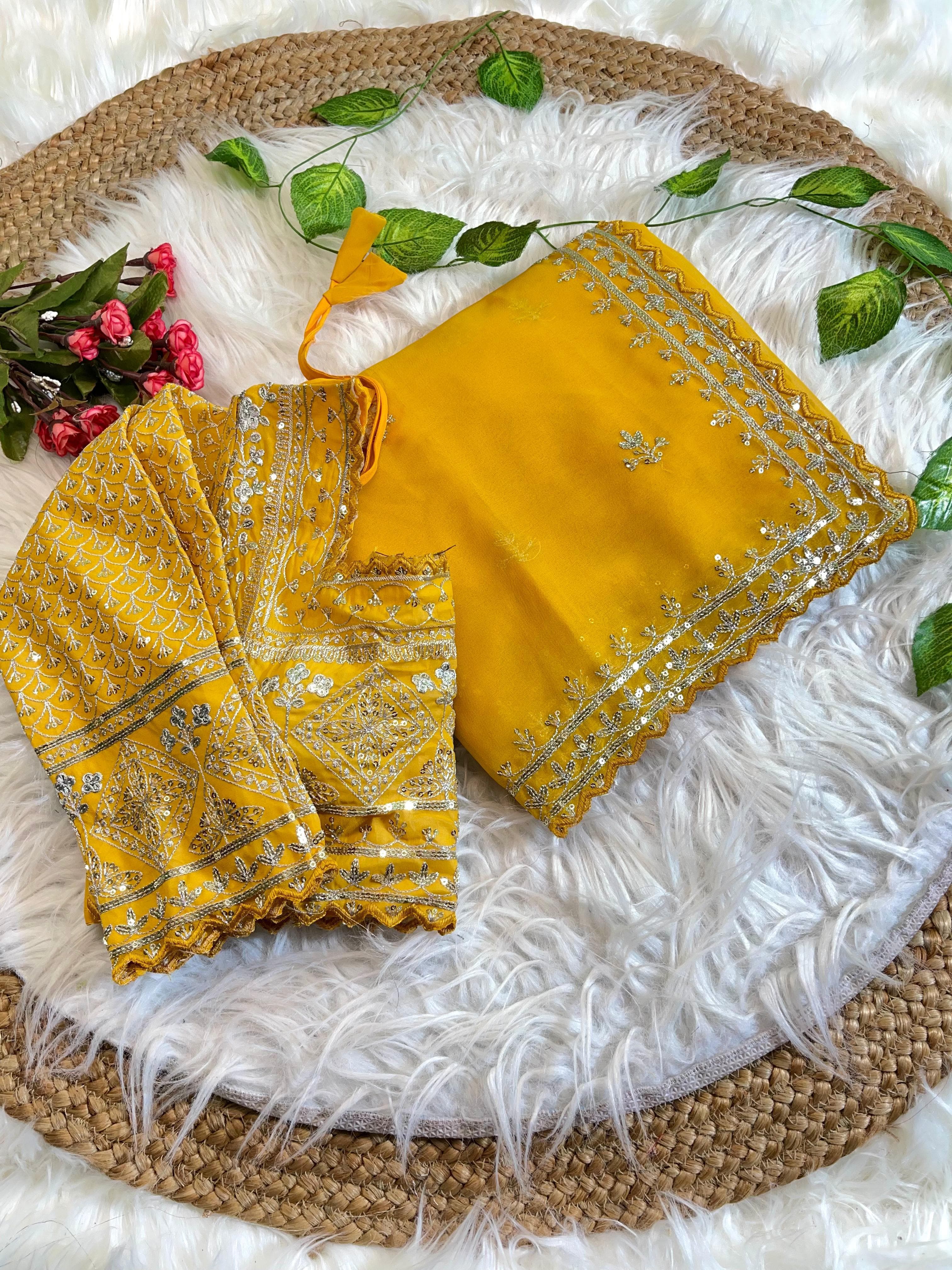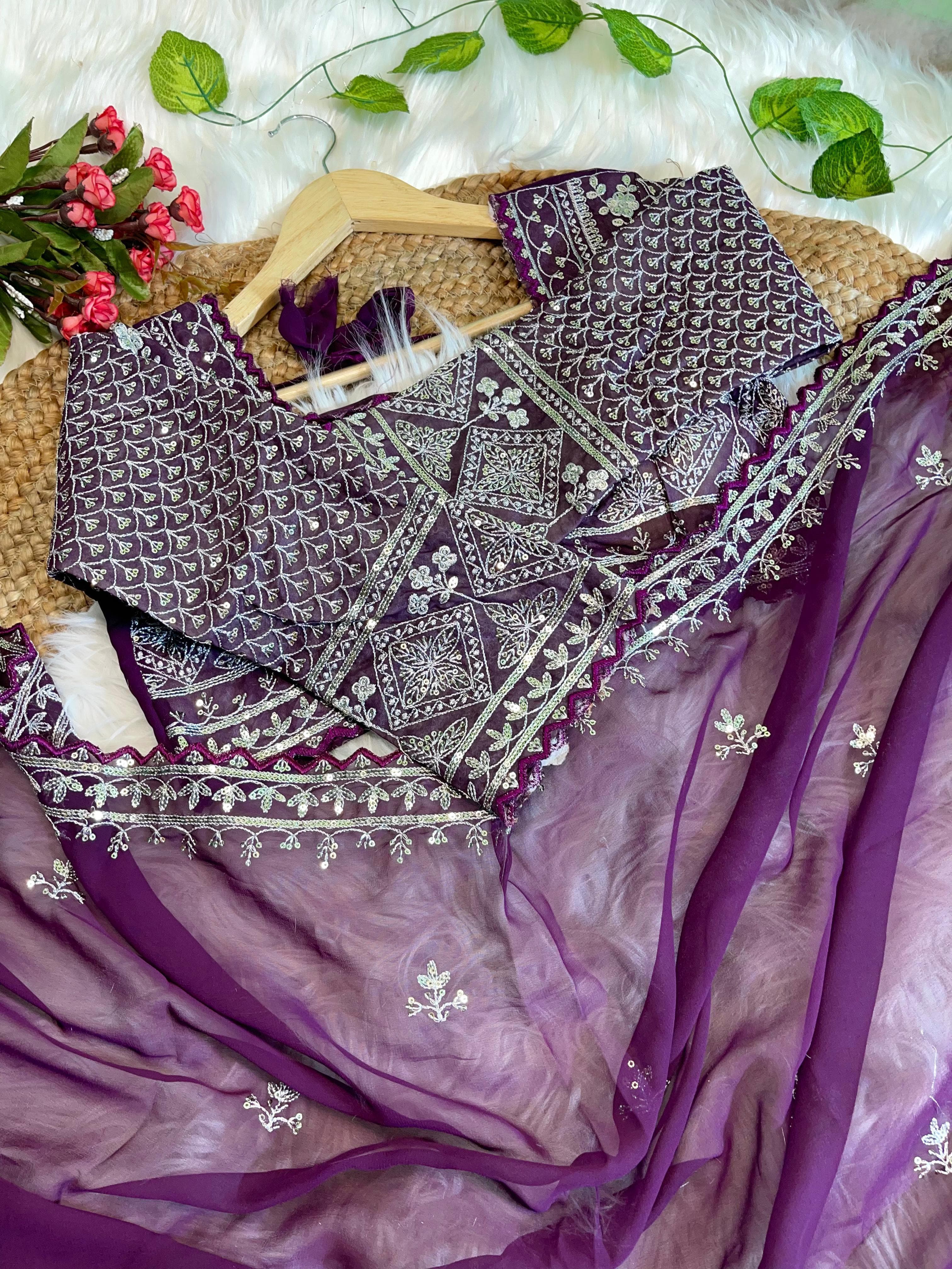 Experience the charm of this pure soft fox georgette saree adorned with exquisite embroidery and shimmering sequins on the border and buttis throughout. The saree is finished with a graceful aarco border that enhances its overall beauty. Paired with a fully stitched running blouse with matching embroidery work, tailored to fit comfortably up to size 42". This premium quality saree is perfect for festive occasions, parties, and celebrations.