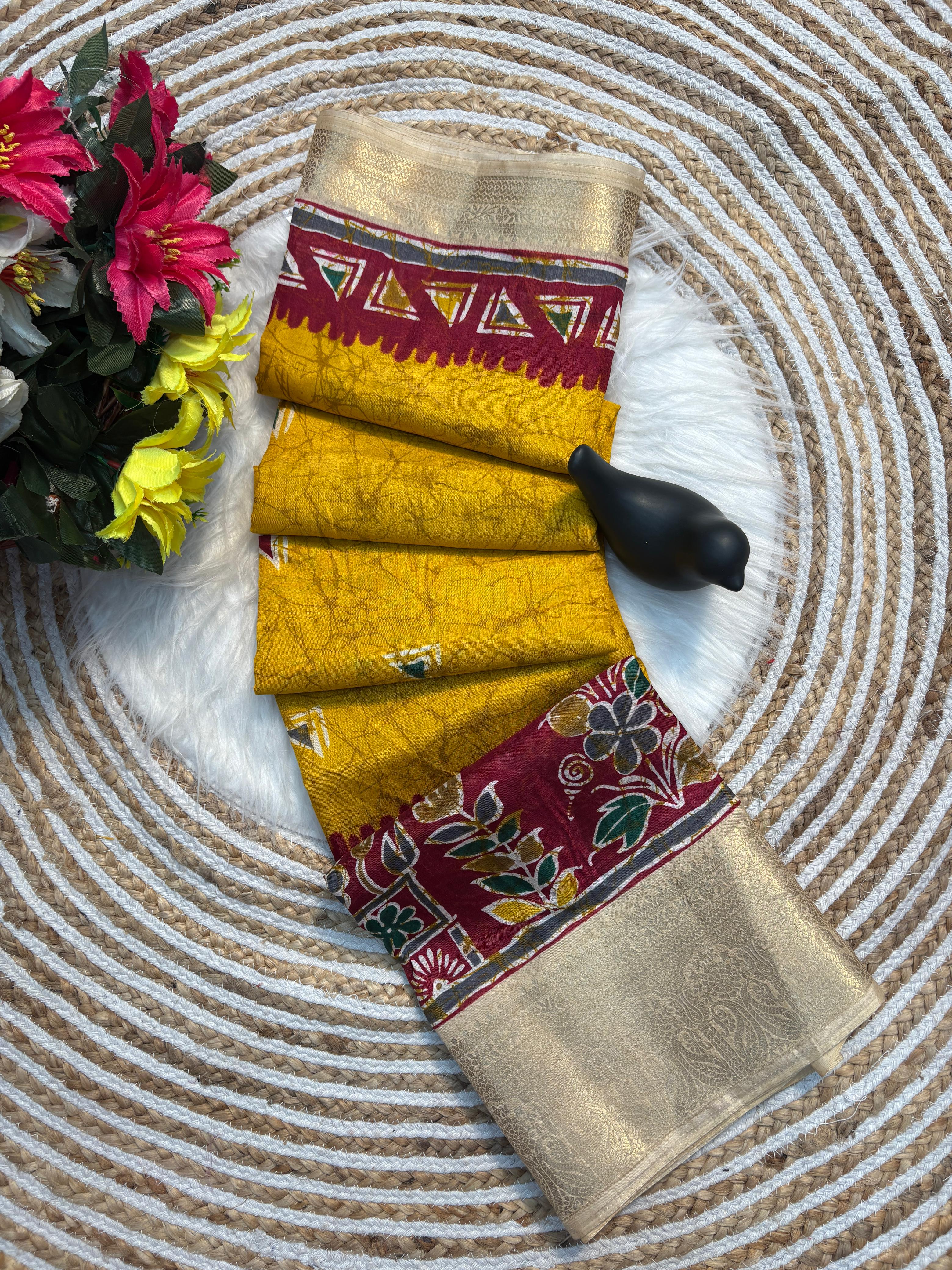 Celebrate timeless elegance with our Ajarakha Prisam Saree, crafted from premium Dola Silk and finished with a luxurious Jacquard border. This saree features a super soft feel, offering a graceful fall and comfort all day long.